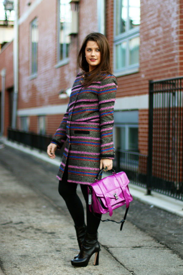 If anyone in Chicago was going to own a custom python snakeskin Proenza Schouler PS1 handbag, it would be Jena Gambaccini of ChiCityFashion. It was a blast to finally photograph Jena with her new bag last weekend since I was one of the first people she told right after she won the CharityBuzz auction. She was very secretive about the process, which made her announcement last week so much better. As part of the prize, Jena flew out to New York to meet with Proenza Schouler designers Jack McCullough and Lazaro Hernandez to design her bag. The final product is a purple python bag with black python accents and a neon yellow silk interior. A dream come true, right? And all the money was donated to charity. Jena is one of the raddest and down-to-earth fashion lovers I’ve ever met. It’s not only because of a mutual love of neon colors, it’s because she kicks ass at life. I couldn’t wait to share my photos of her holding her custom PS1 with my readers!