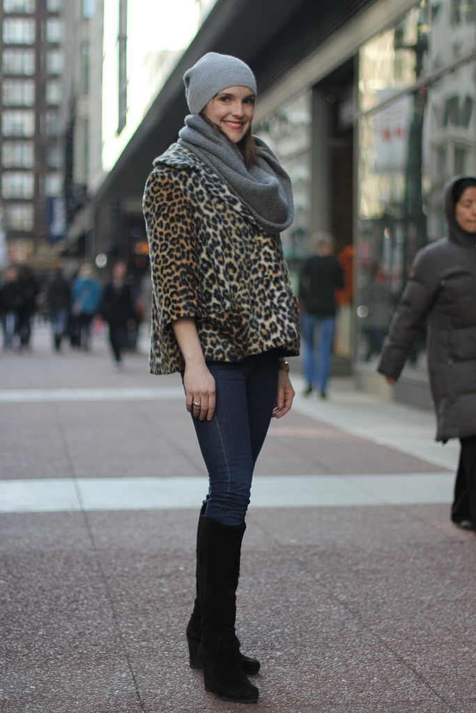 For the woman who wants to be noticed, look no further than a leopard print cape. Grace instantly caught my eye for fearlessly wearing such a bold pattern in a whimsical silhouette amidst the sea of puffy coats on Chicago’s sidewalks… literally. After I approached her, I wasn’t surprised when she excitedly told me that she also tweets and tumbles herself and has always wanted to be on a street-style blog. Well over half of the fashionable women I stop on the streets these days either run their own blogs/Tumblrs or are involved in some sort of creative social media (Pinterest, Instagram, etc.). Just two years ago it wasn’t uncommon for the stylish people who I stopped to ask me what a “blog” was… not any more!