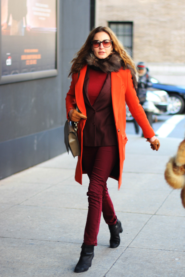 Have you ever seen a more perfect fall look built on color-blocking? Ece Sukan, an editor at Vogue Turkey, had a preternatural preference for the “IT” shade of Fall 2012. Her rich raspberry pants, pumpkin orange overcoat, deep burgundy blazer, and saturated oxblood top combine to create a magical symphony of autumnal color. These colors look simply sublime next to one another, and yet the risk of clashing is so great. When Don Draper tells Peggy Olson in Mad Men that good ideas and bad ideas for an advertising campaign are extremely close the same concept applies to fashion. The term “fashion risk” refers to bringing one’s look right up to that demarcation; the edge is where style is born. This woman (who has been identified by a lovely reader as Ece Sukan) knew exactly how to mix these jewel tones in daring yet wholly sophisticated manner. The neutral accessories – black ankle boots, sumptuous leather gloves, a fur collar and taupe purse – help ground this look, as does the tailoring and solid emphasis on colorblocking. A print would have surely been far too much energy on top of these competing hues.