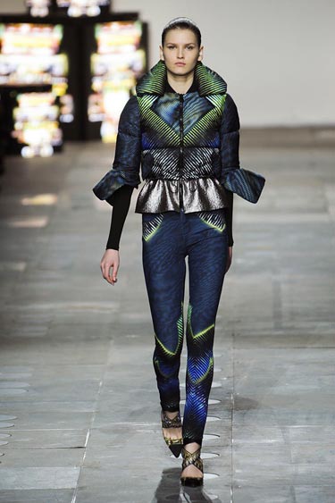 When I saw the Peter Pilotto Fall 2012 collection I couldn’t resist posting the photos. My god, the architecture! The fit! The sublime use of print and texture! Although the jagged sawtooth print has become a signature for Peter Pilotto and his partner Christopher DeVos, the duo continues to experiment with silhouettes for a modern approach to ladylike dressing. That is, if you’re a lady who enjoys science fiction, which I immediately saw referenced despite fashion journalists reporting that the partners were inspired by Asian culture. There’s an astrophysical element permeating this collection, and not in the Haider Ackermann alien goddess sort of way. The Ackermann woman is a Tilda Swinton-esque female with predatory undertones and a penchant for loose silk; the Pilotto woman is no less intimidating, but she has table manners and a more conventional pin-up glamour, although she too is twinged with the space age. I’m making vast over-generalizations, obviously, but those are the two different vibes I get from each brand.