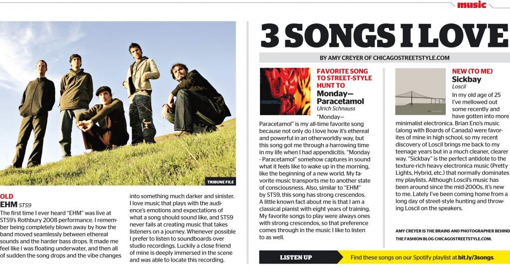 A couple weeks ago an editor from the RedEye newspaper asked me to write about my three favorite songs; an old standby, a new infatuation, and one I love to listen to while street-style hunting. For those of you who don’t live in Chicago, the RedEye is the Tribune’s free daily paper aimed at commuters in the 12 million + metro area so this was a huge honor, considering I’m a fashion blogger and not a music blogger. Although I rarely talk about music on my blog or on twitter, I listen to it constantly. I’ve been into downtempo since early high school, when I found Zero 7, Portishead, and Thievery Corporation in 10th grade. Senior year of high school I was really into Radiohead, Goldfrapp and Pink Martini; my dad and I listened to Felt Mountain and Sympathique on repeat the whole drive up to Michigan State in August 2004. The songs on those albums will always remind me of how I felt on that 15-hour journey to East Lansing from Fayetteville; equal parts painful nostalgia and unbridled excitement at beginning the adult phase of my life. I didn’t know a single person in the whole state of Michigan. I’m an adventurous soul, but I’m not going to lie and say it was easy. Moving away – alone – was very, very difficult for the first two months at MSU and music got me through it.
