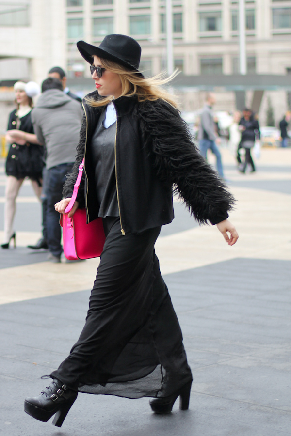 There are so many things I love about this photo. Firstly, it’s a candid. If any of you recognize her, please leave her name and/or blog in the comments so I can add it to the post. Secondly, it’s the pops of pink on the Cambridge satchel and her pink lips. And last but certainly not least, the lines in this photo are simply phenomenal. Look at the folds on her dress, the individual tufts of fur, and the way her hair is streaming in the wind. I named this photo Velocity because visually it captures the spirit of always moving forward, something all of us should keep in mind. Don’t ever get stuck in the past, because the best things in life are always ahead of us.