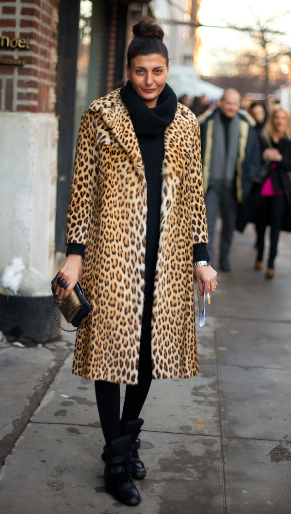 Giovanna Battaglia, the stunning model turned W Magazine editor (and girlfriend of Vladimir Restoin-Roitfeld), transforms a leopard print coat and great sneakers into a covetable look. After watching showgoers tip-toe around slush in delicate open-toed boots, spotting Giovanna in fashionable – yet logical – sneakers was a breath of fresh air. You’ll never see Giovanna trying too hard. She’s so cool, which why her style is closely followed in magazines and blogs around the world. I always look forward to photographing her at fashion week so it was a treat to see how she dresses in a snowstorm. Plus, it’s the perfect winter inspiration for my Chicagoans back home!