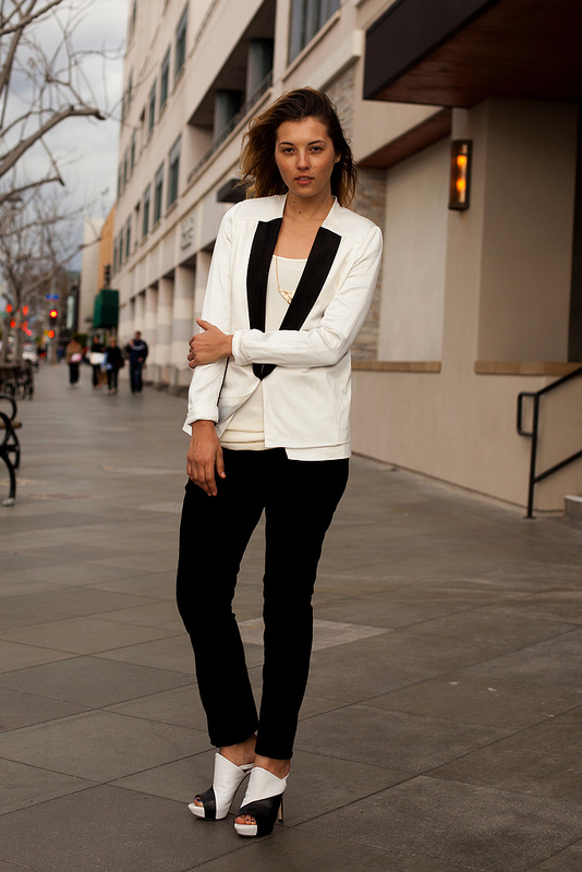 Leah’s raw Chicago sensibility translated well onto a classic laid-back California girl like Kelsey. Trends are endlessly customizable – that’s the beautiful thing about fashion! I found this gorgeous designer tuxedo jacket at T.J.Maxx for an unbelievable $179.99, compared to $360 elsewhere, and added some edge with a pair of black and white boots. A fitted jacket is a great investment piece since you can wear it in so many different ways as Leah and Kelsey illustrate perfectly!