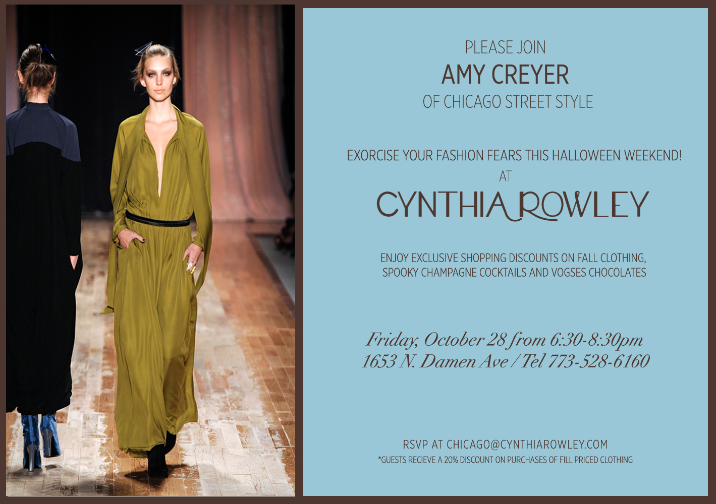 Come celebrate Halloween weekend with me in style at Cynthia Rowley’s Bucktown boutique at 1653 North Damen. Enjoy complimentary “bloody” champagne cocktails and Vosges chocolates, along with a hefty 20% discount on all new and sale items. This is perfect party to kick off the Halloween weekend, since it runs from 6:30 to 8:30 on Friday evening, October 28. You can easily head to your rowdy Wicker Park bars and house parties afterward. Why not start the Halloween weekend with fashion!