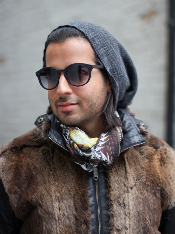 I spotted Kaveh walking down Rush Street with his friend a few days ago. I love the louche look of a beanie combined with more luxurious elements like a Givenchy scarf and Bottega Veneta sunglasses. It’s a damn cool way to bring a high fashion look down to earth. Off-duty models are the most visible fans of this look in the fashion week universe. What better way to cover up messy hair while dashing from show to show? Even designer labels Tibi and T by Alexander Wang jumped on the trend, featuring beanies in their Fall 2011 collections.